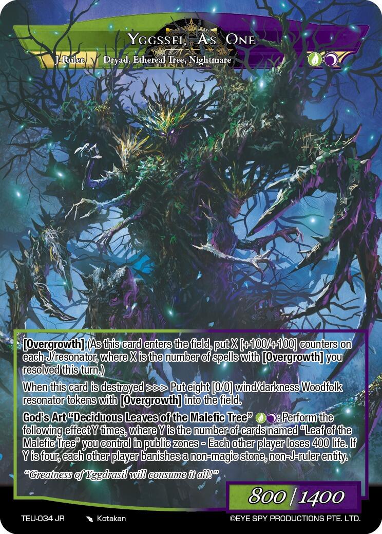 When this card is destroyed >>> Put eight [0/0] wind/darkness Woodfolk resonator tokens with [Overgrowth] into the field. God's Art "Deciduous Leaves of the Malefic Tree" GB: Perform the following effect Y times, where Y is the number of cards named "Leaf of the Malefic Tree" you control in public zones - Each other player loses 400 life. If Y is four, each other player banishes a non-magic stone, non-J-ruler entity.